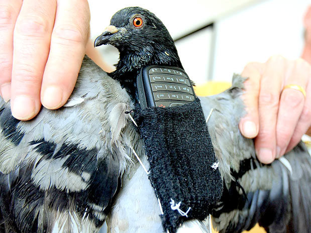 Um caso totalmente inusitado está deixando a Polícia Civil de Pirajuí (uma cidade que fica a 384 km de São Paulo) intrigada. Depois que dois pombos foram encontrados nas proximidades de uma penitenciaria, todos os dois carregavam duas pequenas bolsas, onde carregavam celulares. Tudo indica que eles estão levando os aparelhos para dentro da cadeia e sendo utilizados pelos detentos. Ao contrario do que se parece, segundo mostra as investigações, eles não foram treinados para tal ato, mas estão sim sendo alimentados por alguém do lado de fora, já que os pombos fizeram ninho dentro da penitenciária e é pra que eles voltam no final do dia, e sabendo disso certamente seu “tratador” tentou tirar proveito colocando as bolsinhas nos pássaros. Mas tudo isso não passa de suspeitas, os policiais já pediram quebra no sigilo de um dos celulares (o único com chip) para que possam descobrir a origem desses aparelhos.