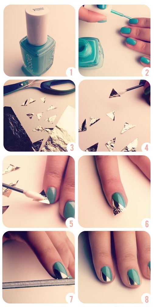 3. As folhas de ouro são muito delicadas, é muito importante que você se certifique de que suas mãos estejam limpas e secas antes de manusear. Eles rasgam com muita facilidade! Use a tesoura para cortar pequeno triângulo que se encaixam nos cantos de suas unhas. Você deve cobrir cerca de 1/3 da sua unha, faça seus triângulos deste tamanho;
