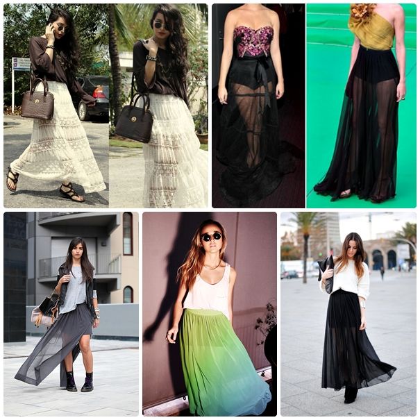 Vestidos e saias compridas estão em alta nesta estação. Mas para fugir um pouco do casual, um novo modelo vem remodelar as saias longas. A transparência associadas às saias vem com todo estilo para atualizar a moda das saias. Transparentes e levinhas, as saia longas podem combinar com vários estilos, dependendo da combinação que fizer. O ideal é maneirar na transparência para não ficar vulgar e usar sempre algo por baixo. O melhor é que dá pra usar com qualquer tipo de calçado, vai depender apenas do estilo que você pretende montar com o modelito. Confiram alguns modelos para utilizar: