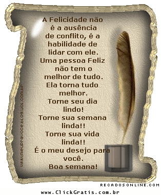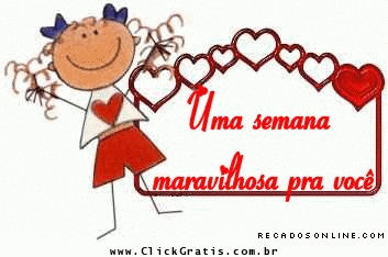 Procurando por uma recado animado de Boa Semana? Na seção de recados animados do Click Grátis você encontra diversas imagens animadas de Boa Semana para enviar aos seus amigos do Facebook e Orkut.