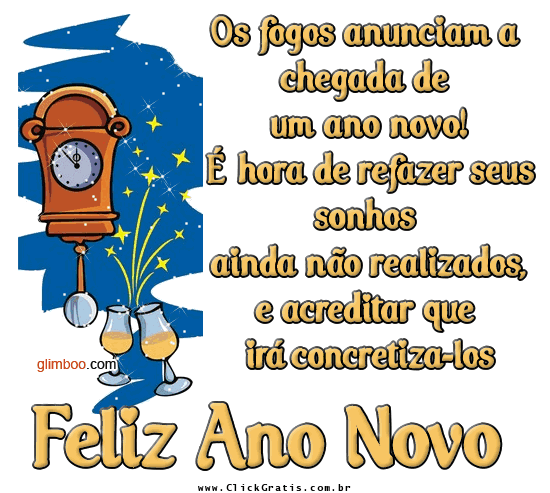 Procurando por uma recado animado de Feliz Ano Novo? Na seção de recados animados do Click Grátis você encontra diversas imagens animadas de Feliz Ano Novo para enviar aos seus amigos do Facebook e Orkut.