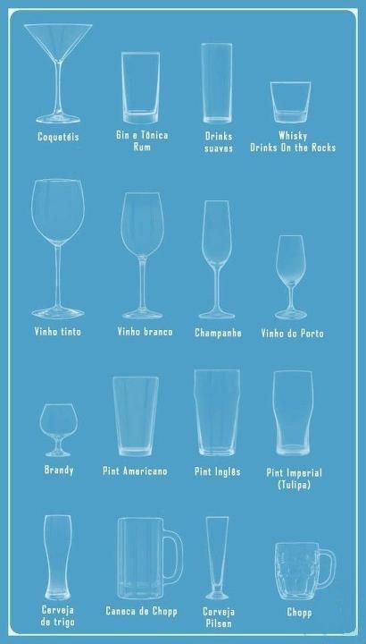 Para que você não tenha mais dúvidas, aqui vai uma rápida apresentação de alguns dos tipos mais comuns de copos, para que você não se embaralhe mais na hora de servir as bebidas em copos errados.