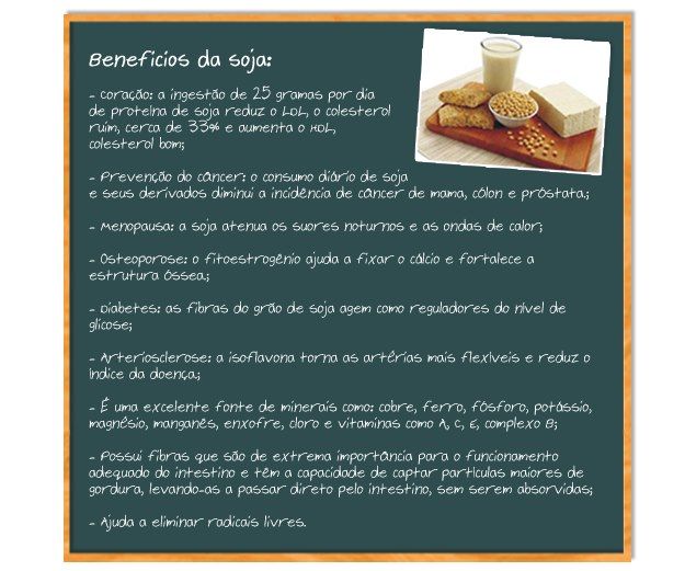 A soja é uma leguminosa, assim como o feijão e é altamente saudável. Ela é rica em proteínas de boa qualidade (possui de 35 a 40% proteínas de alto valor biológico– contendo os 10 aminoácidos essenciais em teor adequado, exceto a metionina), é eliminadora de radicais livres, possui ácidos graxos poliinsaturados (ômega 6 – ácido linoléico – e ômega 3 – ácido linolênico) e compostos fitoquímicos como: isoflavonas, saponinas, fitatos, dentre outros. Também é uma excelente fonte de minerais como: cobre, ferro, fósforo, potássio, magnésio, manganês, enxofre, cloro e vitaminas como A, C, E, complexo B. Além disso, possui fibras, que são de extrema importância para o funcionamento adequado do intestino e têm a capacidade de captar partículas maiores de gordura, levando-as a passar direto pelo intestino, sem serem absorvidas.
