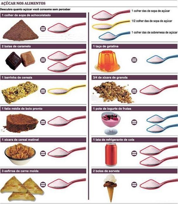 Para driblar este problema, abaixo estão duas imagens muito interessantes. Os criadores pegaram a quantidade de açúcar que há nos alimentos e fizeram uma comparação de quanto seria em cubo e colher. Desta forma, o choque é muito maior, pois quem visualiza se dá conta das altas quantidades de açúcar que ingerimos.