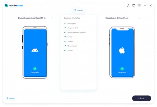 Você pode recorrer ao botão “Inverter” caso a ordem dos telefones de origem e de destino apareça inversamente ao que você deseja.
