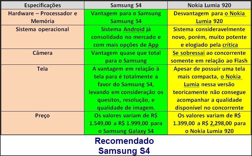 Quadro comparativo entre o Nokia Lumia 920 e o Samsung S4