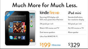 Na propaganda divulgada, o Kindle Fire HD aparece sendo comparado com o iPad Mini com os dizeres “Muito mais por muito menos”. A propaganda também mostra pontos onde o Kindle Fire supera o iPad Mini, destacando principalmente a qualidade da tela, onde o aparelho da Amazon mostra superioridade por um menor preço.