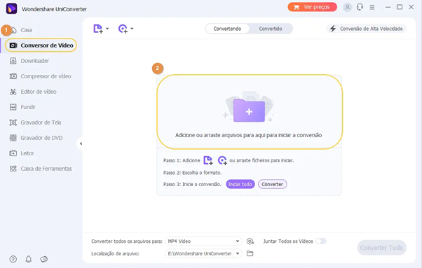 Converter vídeos usando o UniConverter não é nada complicado. Basta você abrir o programa em seu PC e selecionar o ícone “Conversor de Vídeo” no lado esquerdo do painel do menu principal.
