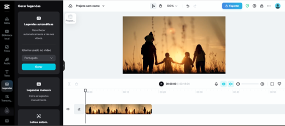Essa função é ativada dentro do seu projeto de vídeo, no menu à esquerda. Clique em “legendas”, seguido de “legendas automáticas”. Escolha o idioma original do áudio do vídeo e clique em “gerar”.