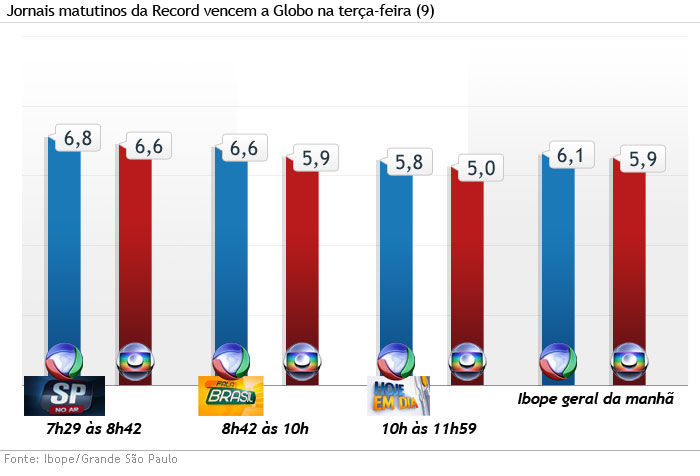 Nesta manhã do dia 9, os programas da Record, SP no Ar, Fala Brasil e Hoje em Dia, lideraram a audiência, deixando a Globo para trás. A pontuação dos programas da Record superou os da Glo0bo durante a manhã desta segunda-feira. Além desses programas, a novela Vidas em Jogos, alcançou 14 pontos, no último dia 28, dividindo liderança com o jogo Paulista x Palmeiras, do Campeonato Paulista, sendo essa a primeira vez que uma novela da Record conseguiu empatar com um jogo de futebol da Globo.