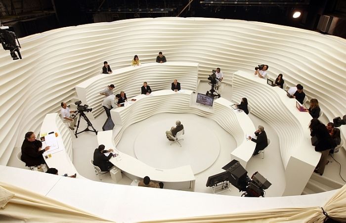 O cenário do programa também é bem interessante e diferenciado dos vários programas de entrevistas comuns, onde o entrevistado acaba ficando dentro de um círculo que é formado por entrevistadores e que ficam em uma posição mais alta. Com isto, o entrevistado deverá ficar em uma cadeira giratória e acaba por se virar para os jornalistas que devem fazer as suas perguntas.